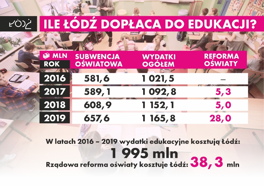 Od początku rządów PiS Łódź dopłaciła już do edukacji blisko dwa miliardy złotych, a wydatki z każdym rokiem rosną. Konieczność dopłacania tak wysokich kwot to zarówno wina niedoszacowanej subwencji oświatowej, jak i złych pomysłów kolejnych ministrów edukacji w rządzie PiS.