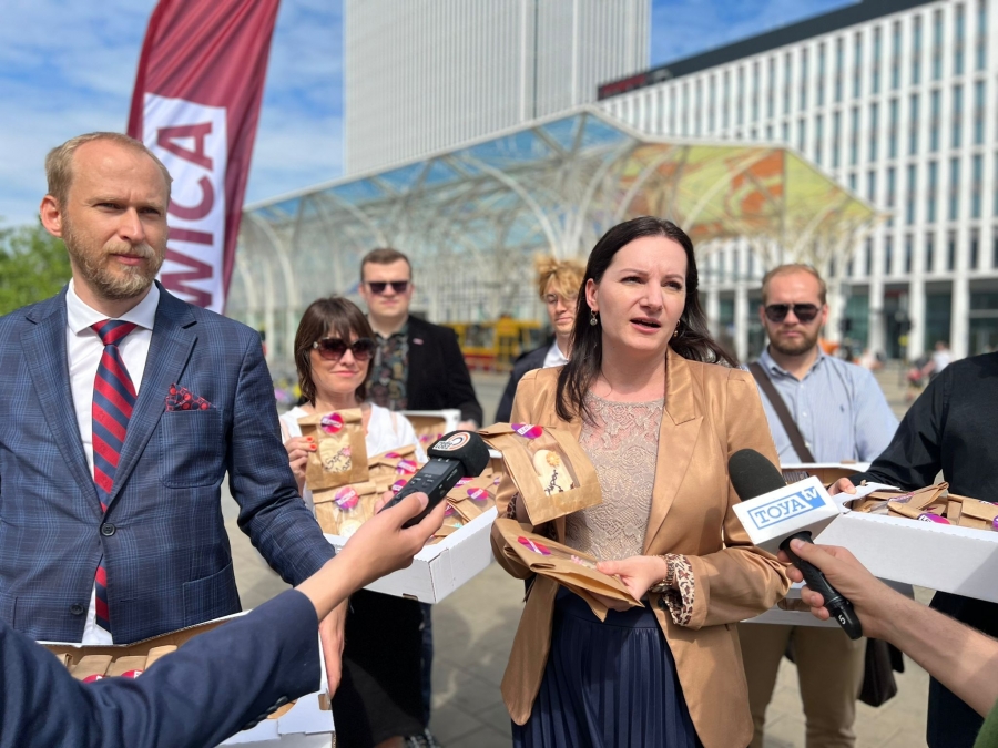 „Dzisiaj wyjątkowy dzień, 26 maja - Dzień Matki. Jak co roku chcemy dzisiaj złożyć wszystkim mamom najlepsze życzenia, przede wszystkim dużo zdrowia wytrwałości. Sama jestem mamą i wiem, że rola mamy to najpiękniejsza rola w życiu, chociaż czasem bywa ona trudna, bywają gorsze dni, ale myślę, że ta satysfakcja z wychowywania dzieci jest najważniejsza. Dzisiaj, by osłodzić te trudniejsze dni w wychowywaniu dzieci, przekazujemy jako Lewica słodki upominek dla naszych super mam. To jest oczywiście owsiane ciasteczko i będziemy dzisiaj rozmawiać z mamami, bo są osoby, które są mamami, które mają mamy, więc myślę, że te życzenia popłyną do szerokiego grona. Ale również pamiętajmy w tym dniu, i Lewica pamięta, o kobietach, które nie mają możliwości bycia mamą” – mówiła Małgorzata Moskwa-Wodnicka, Wiceprezydent Miasta Łodzi, Wiceprzewodnicząca Nowej Lewicy.